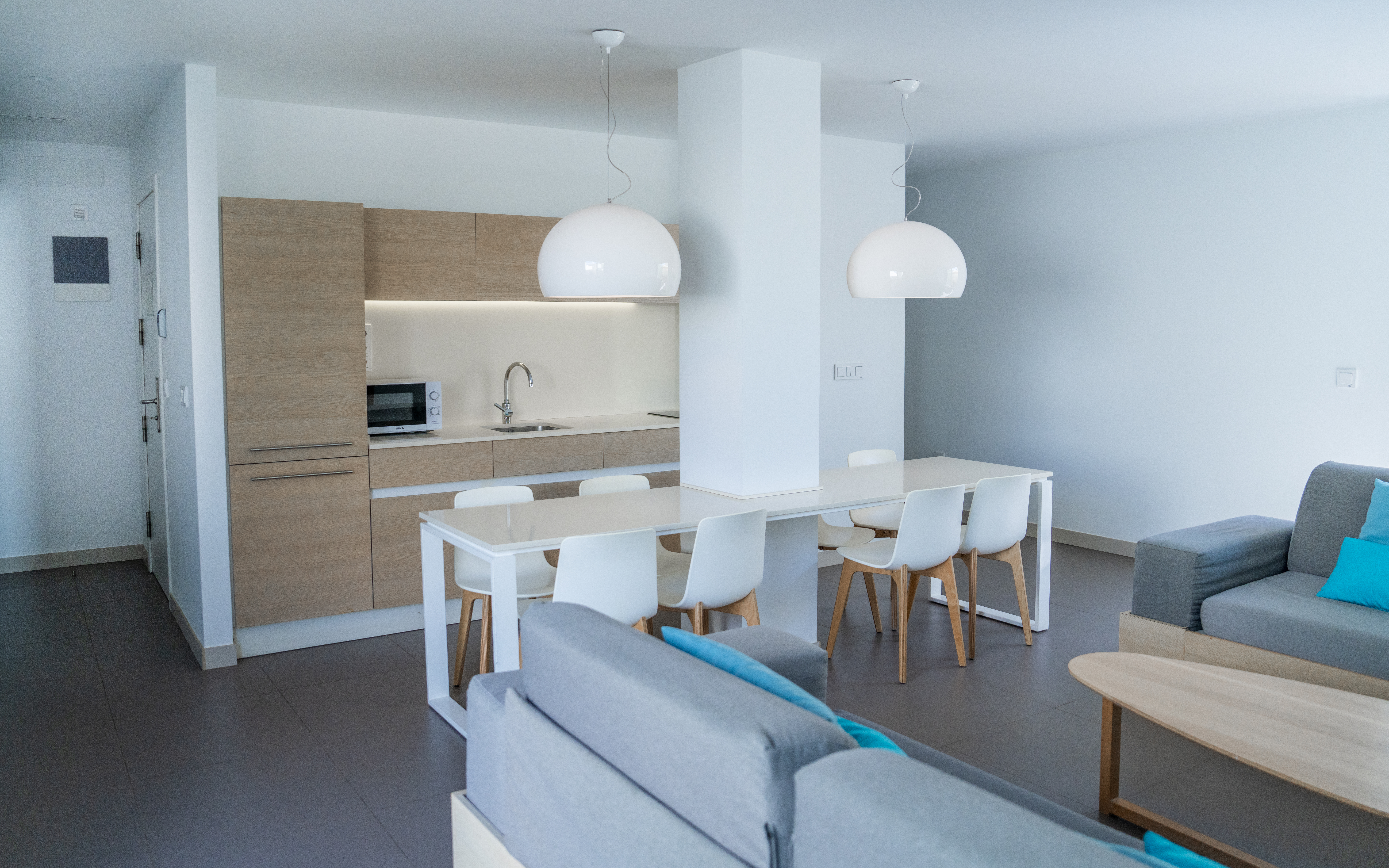 These apartments feature a living room with kitchen, 2 bedrooms and 2 bathrooms, and a terrace. These apartments are more spacious than the standard two-bedroom apartments. With 2 single beds in each bedroom and 2 sofa beds in the living room, the apartment sleeps up to 6 adults.