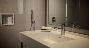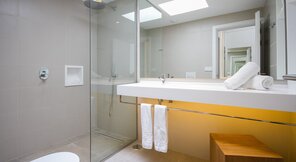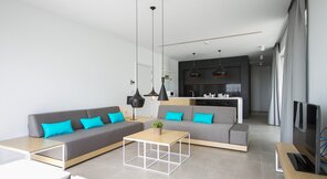 The 158 m2 suite can sleep up to 8 adults. On the ground floor you’ll will find a functional living room with a dining area, comfortable sofa beds and a modern kitchen equipped with the most common utensils and electrical appliances for cooking. The living room and the spacious bedroom lead onto a large terrace with a jacuzzi overlooking stunning views. There are also two bathrooms and a small utility room with a washing machine.