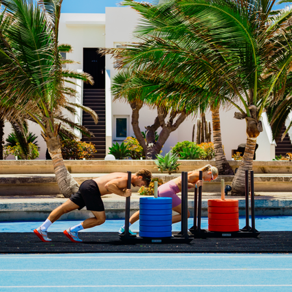 På Club La Santa finder du verdens første udendørs HYROX træningscenter. HYROX er et konkurrencepræget fitness event, og formatet er det samme verden over. Det giver mulighed for globale ranglister og akkumulerede verdensmesterskaber ved afslutningen af hver løbssæson.