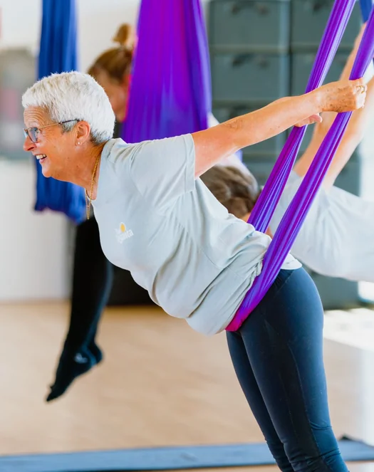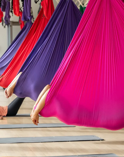 Aerial fitness Konditions- und Beweglichkeitsübungen in Hängematten und auf dem Boden. Unsere Hängematten sind in U-Form aufgehängt, stützen und lassen den Körper hängen, um Flexibilität, Stabilität und Kraft zu verbessern, sowie den Rumpf (core) zu stärken.