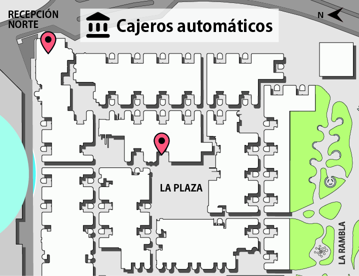 Tenemos dos cajeros automáticos disponibles. Uno está ubicado en la Recepción Norte y el otro en la Plaza.